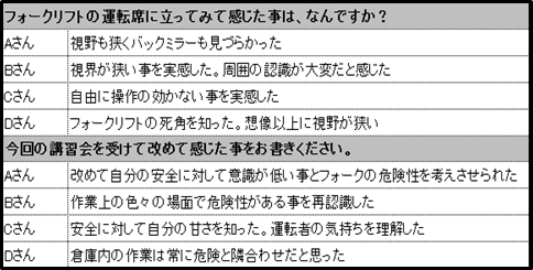 今までわからなかったフォークの視野を実際に体験してみてフォークリフトに対する意識が変わった様に感じます。