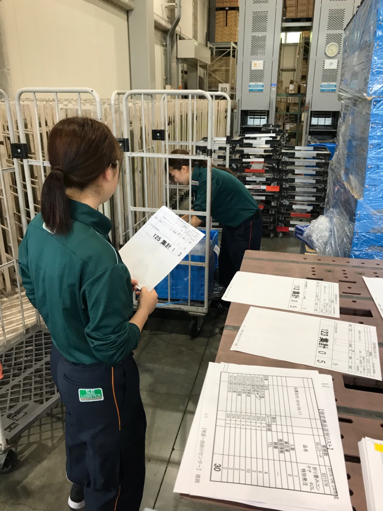 現在1F庫内で特発の仕分け、入荷の検品・出荷の検品作業を行っています。